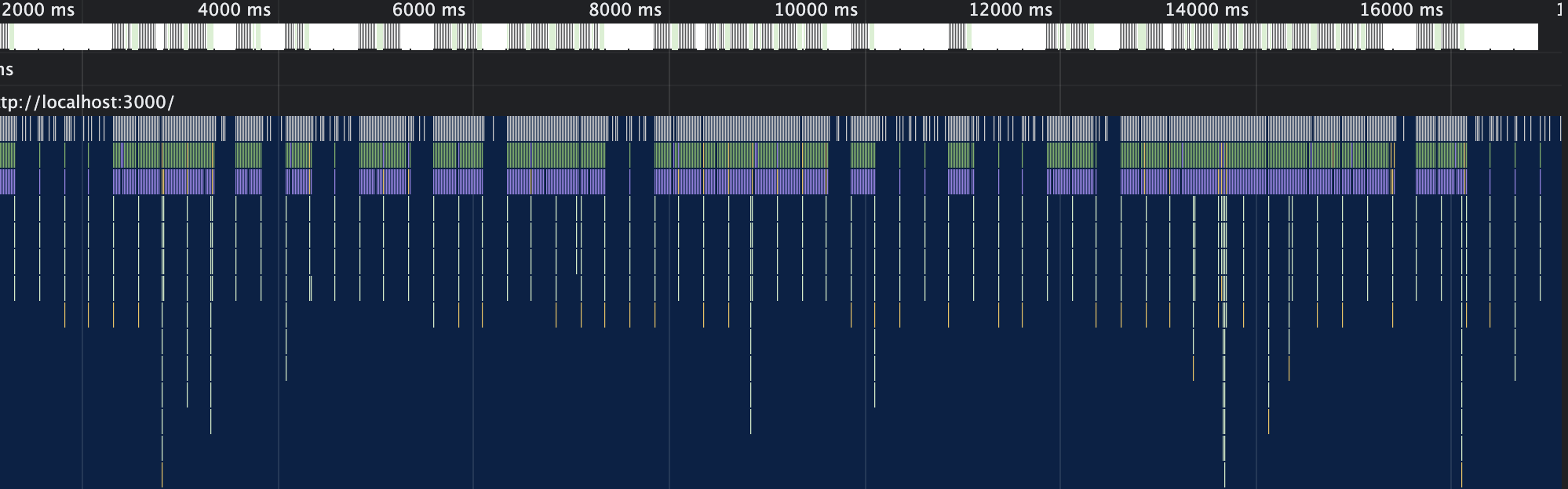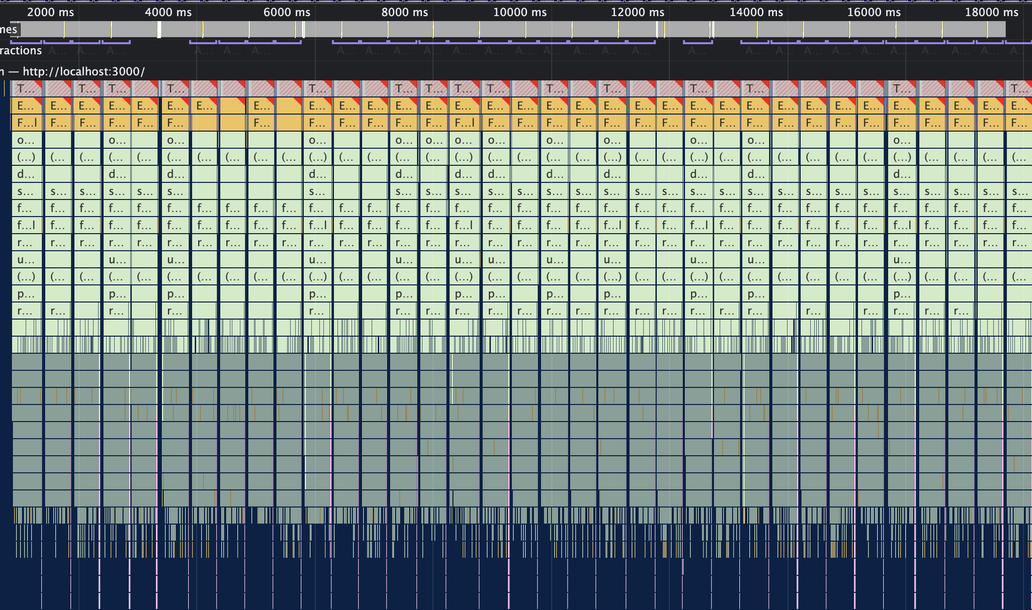 Here’s the flame chart from the performance tab. It’s a sea of red, users on low-powered devices would not be happy. The interface feels sluggish and unresponsive, the active token crawls along significantly behind the audio, and the CPU is straining under the weighty heft of React’s render.